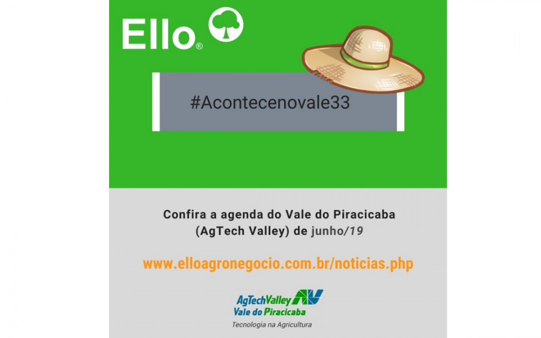 A Ello Agronegócios veicula periodicamente a agenda de eventos do Vale do Piracicaba. Quando for compartilhar os eventos, use a hashtag #acontecenovale. Vamos nos conectar! Para divulgar seu evento, envie e-mail para flavia@elloagronegocio.com.br Agrotic Data: 08 e 09...